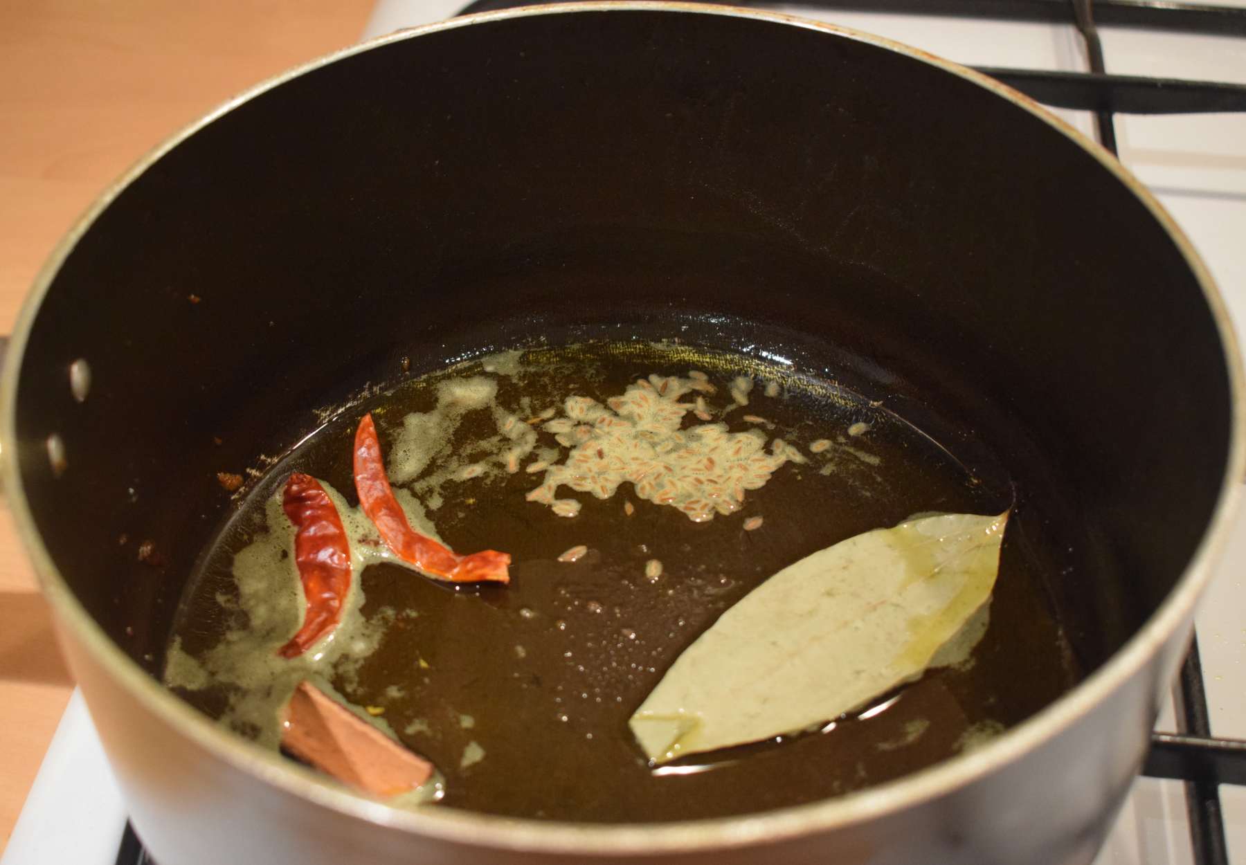 - In the same pan, add the whole spices cumin seeds, cinnamon stick, bay leaf, dry red chillies for tempering and let them crackle.