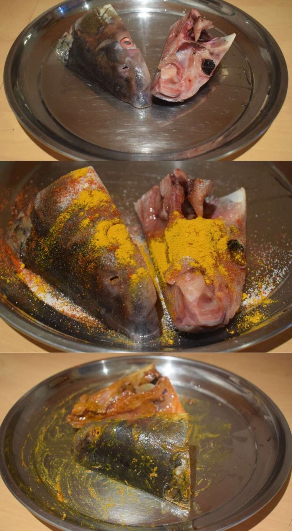 - Marinate fish head with Salt, Red chilli powder, Turmeric and keep it aside for at least 10 minutes.