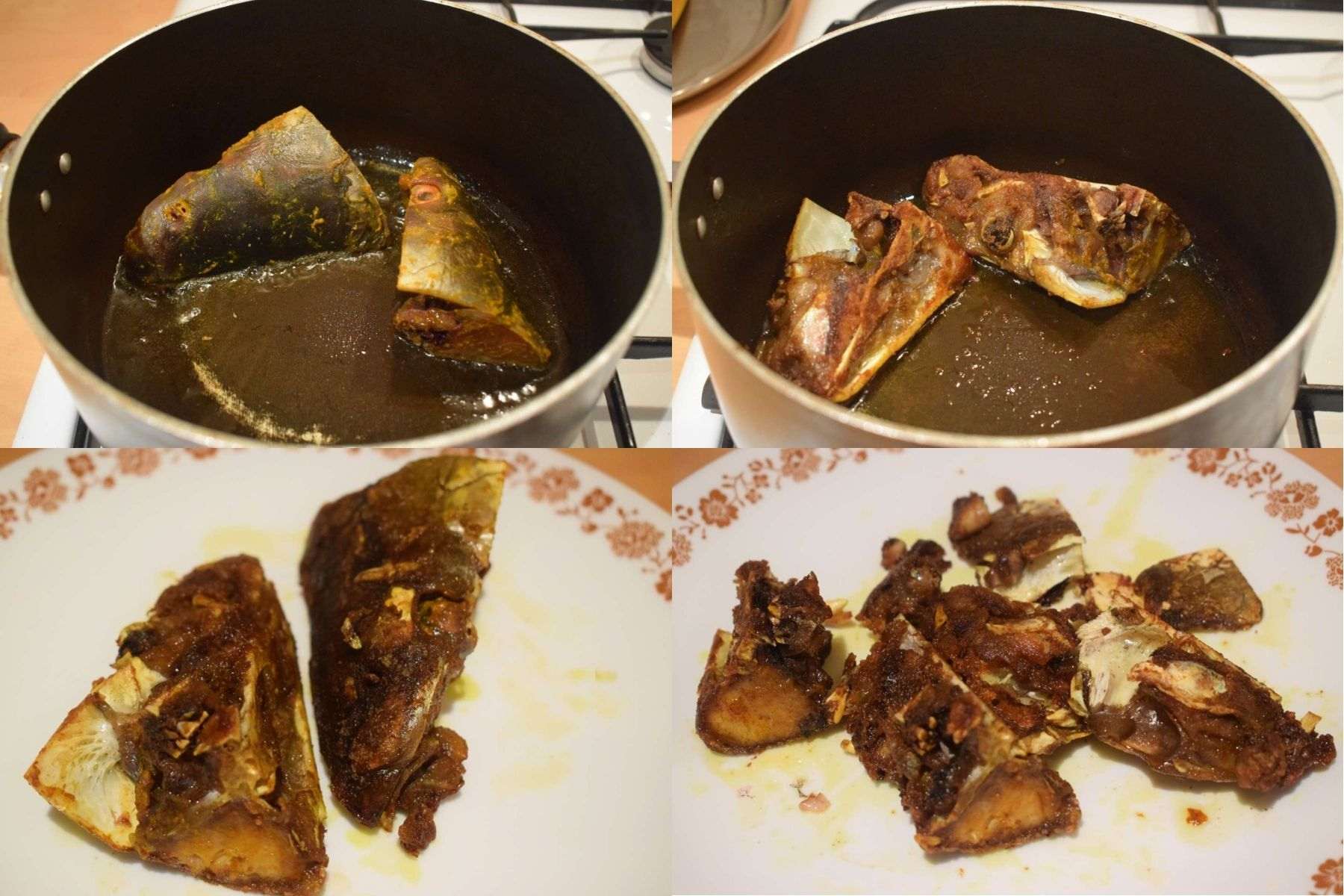 - Add the fish head pieces (Step 1) into the pan. Deep fry the fish head in medium high flame for 5-6 minutes until they become crispy brown. Flip the fish head pieces and fry the other side of it in same way. Keep the Rohu fish head aside and break them.