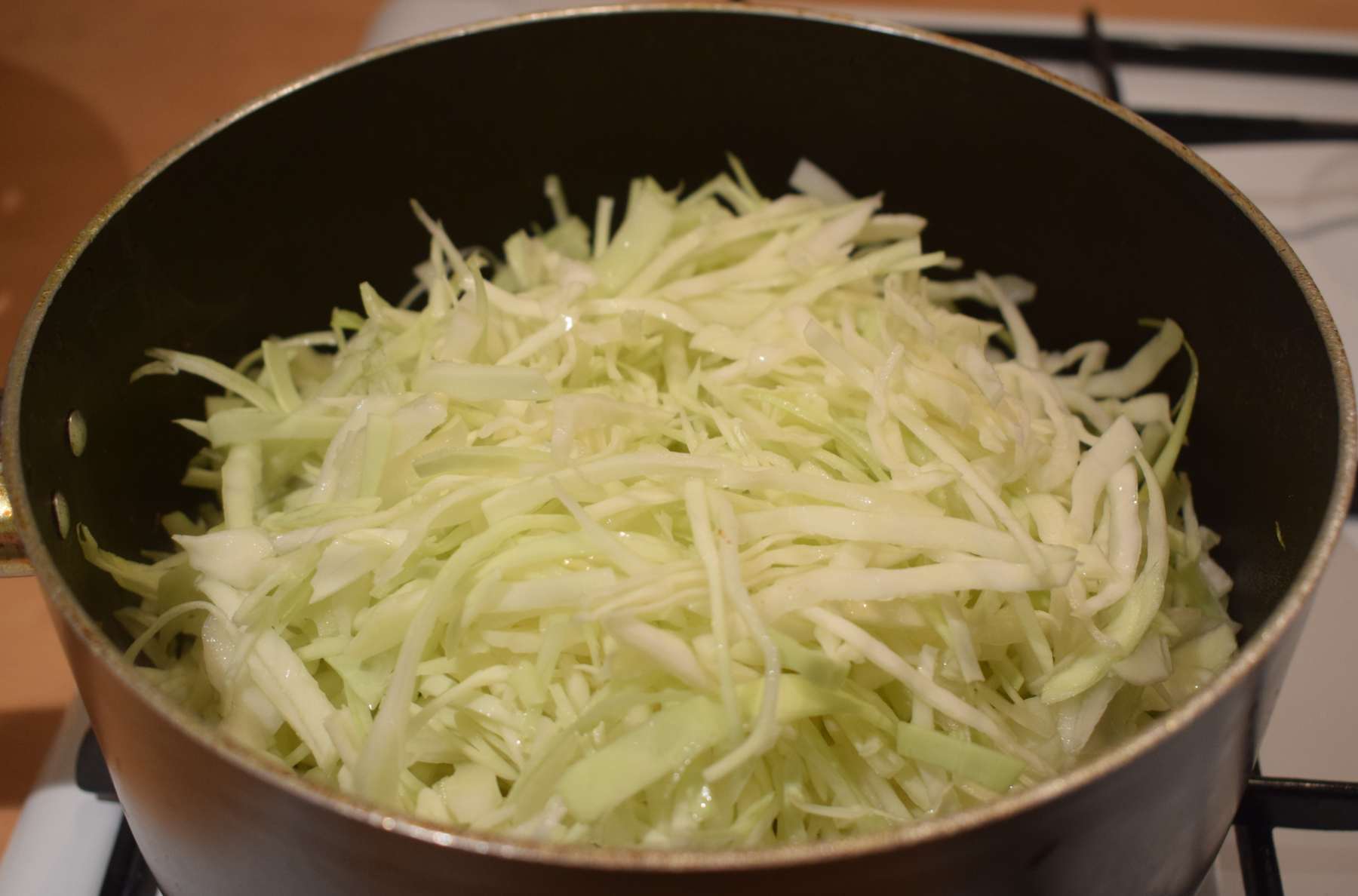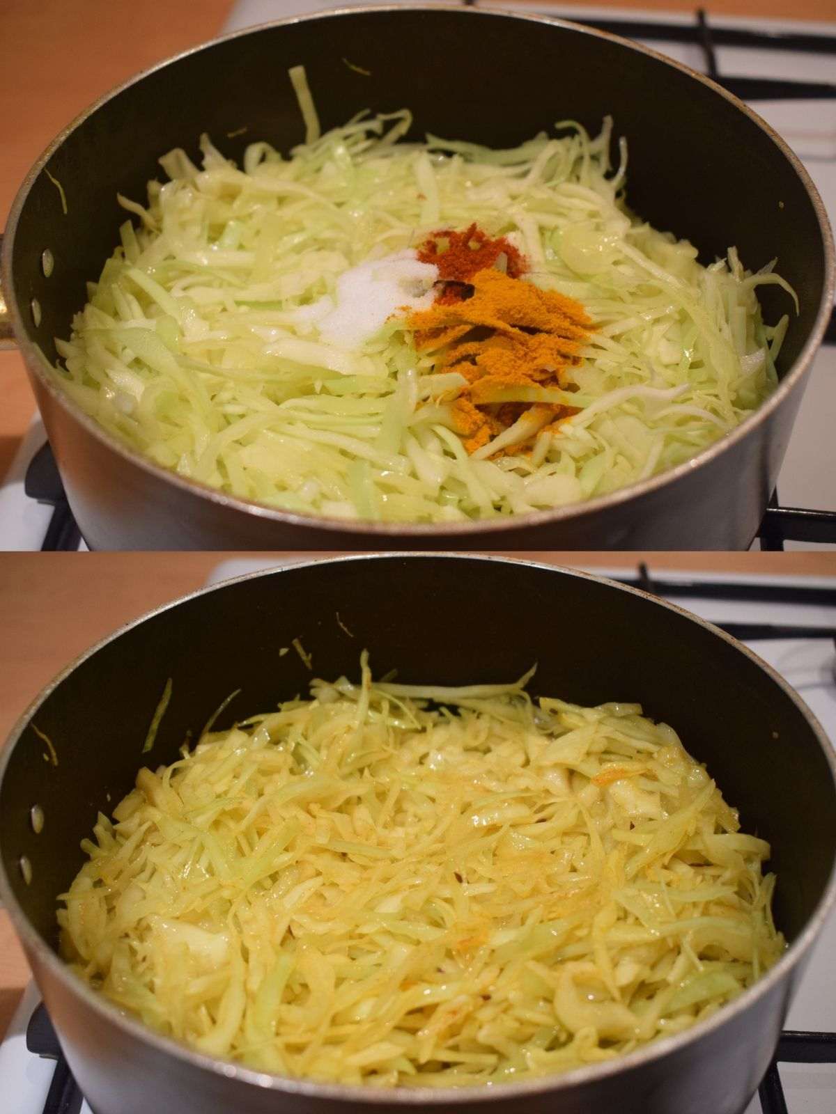 - Add shredded Cabbage (Step 2) into the pan and give a nice mix.