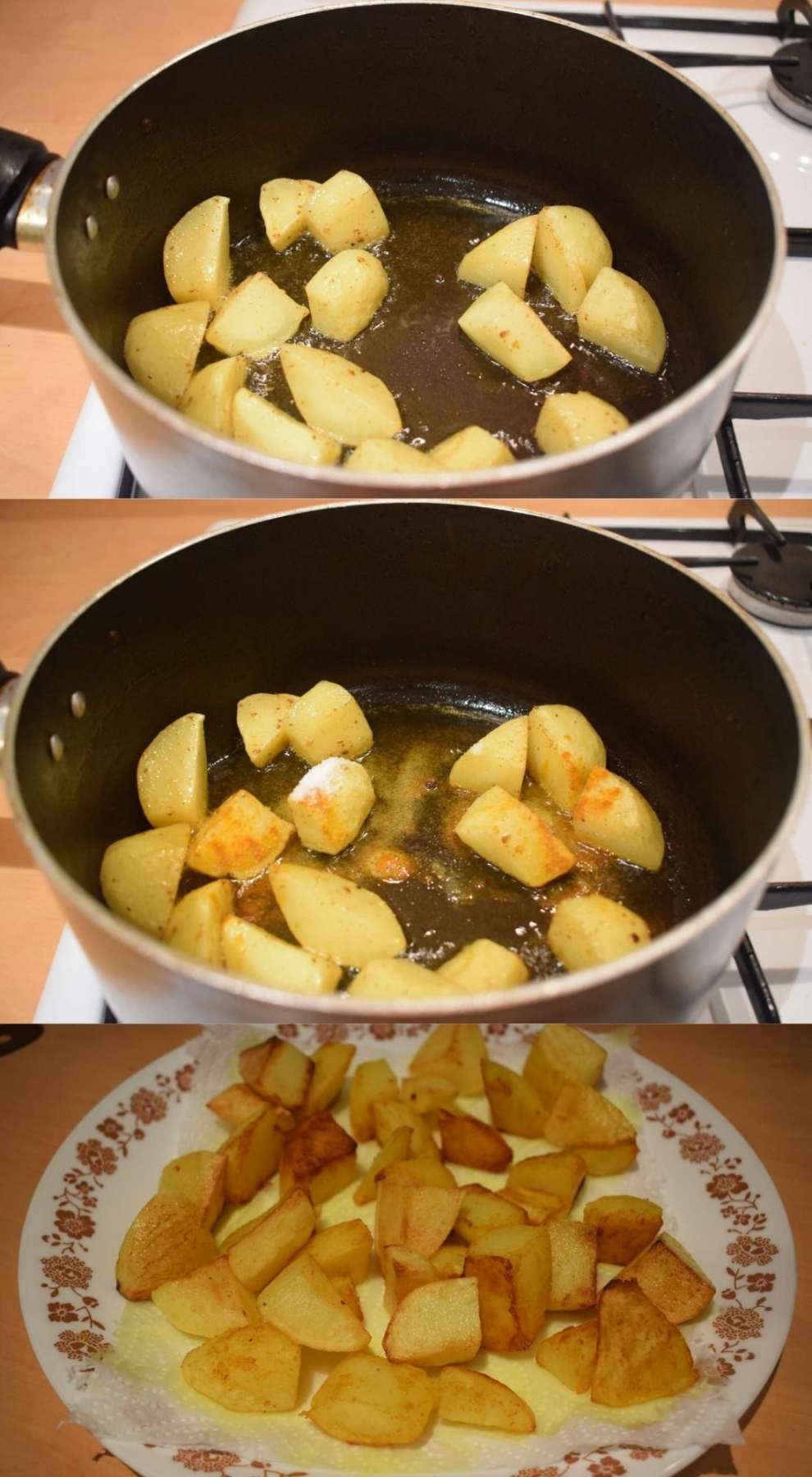 - In the same pan, add potatoes and fry them in medium high flame for 5-6 minutes. Add some salt and turmeric powder into the pan and give a nice mix. Stir in between. Fry the potatoes until they become crispy golden-brown from outside. Keep the potatoes aside.