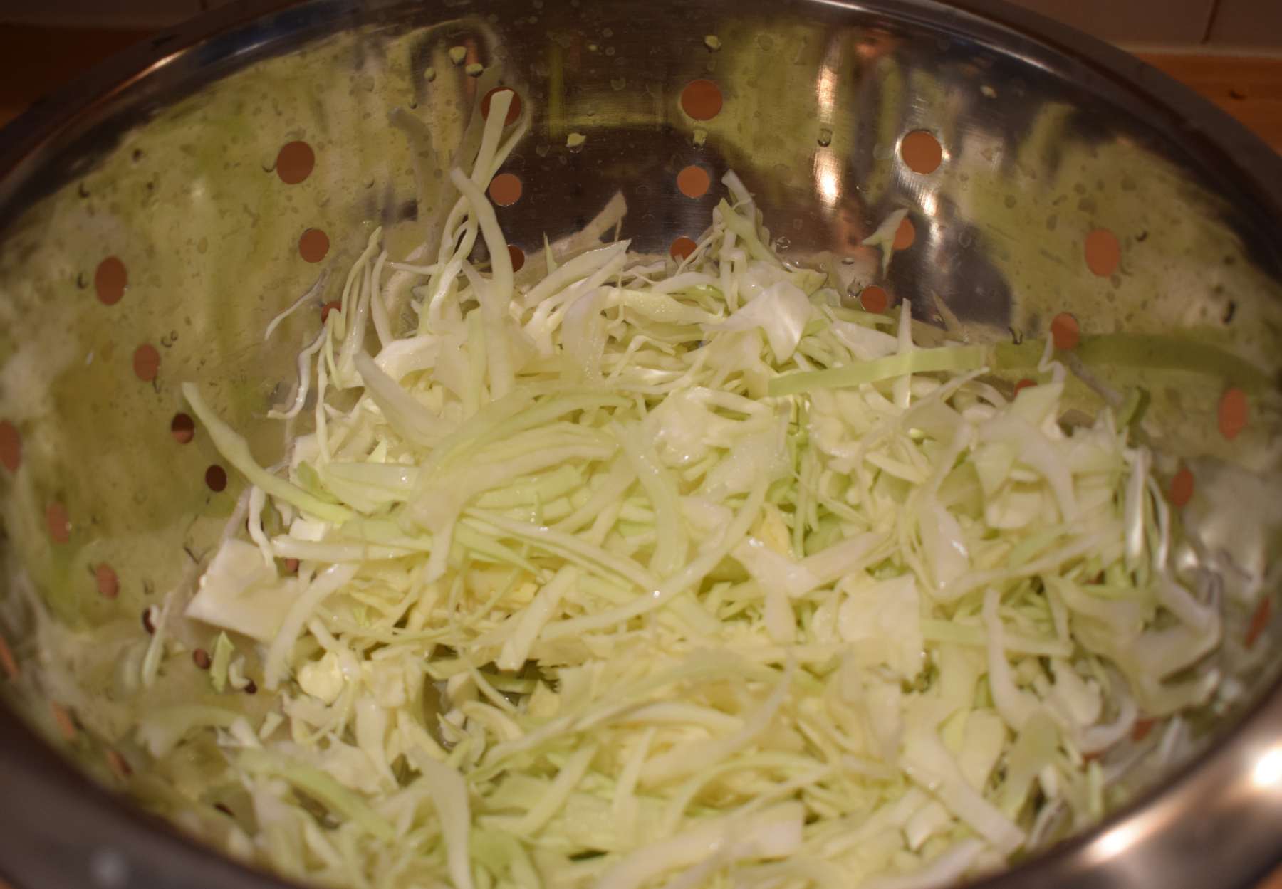 - Wash the shredded Cabbage in a strainer and keep it aside to drain water.