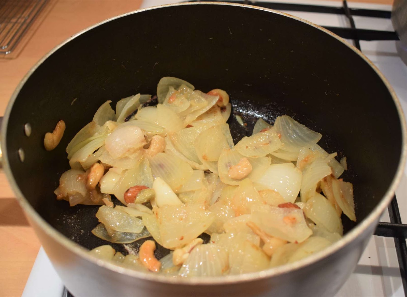 - Put the flame in low and add the onion masala paste (Step 16) into the pan.