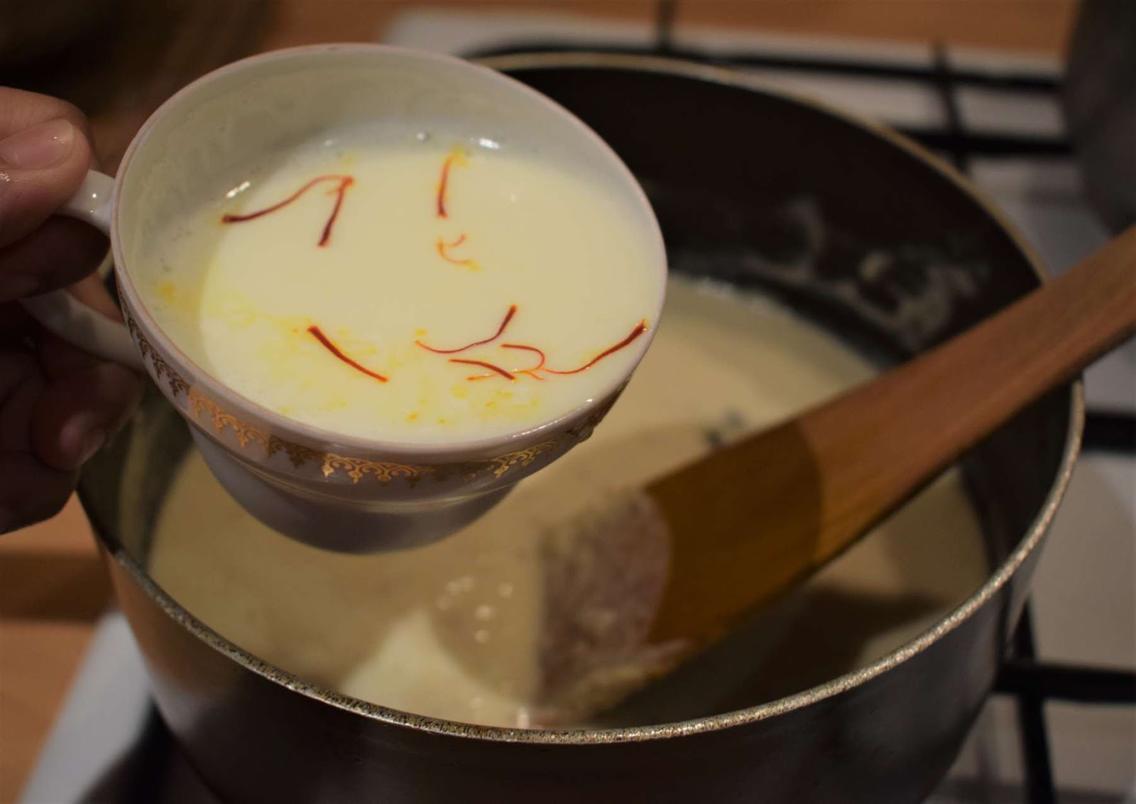 - Add the Saffron milk (Step 6) into the pan and give a nice stir.