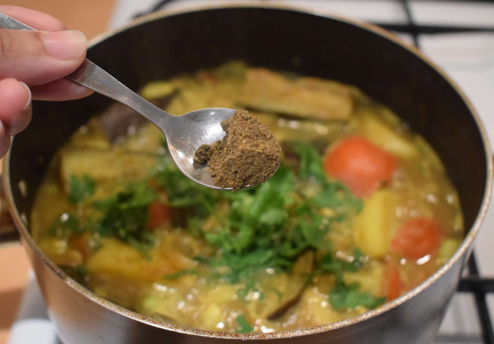 - Add chopped cilantros, roasted panch phoran powder into the pan and mix it well.
