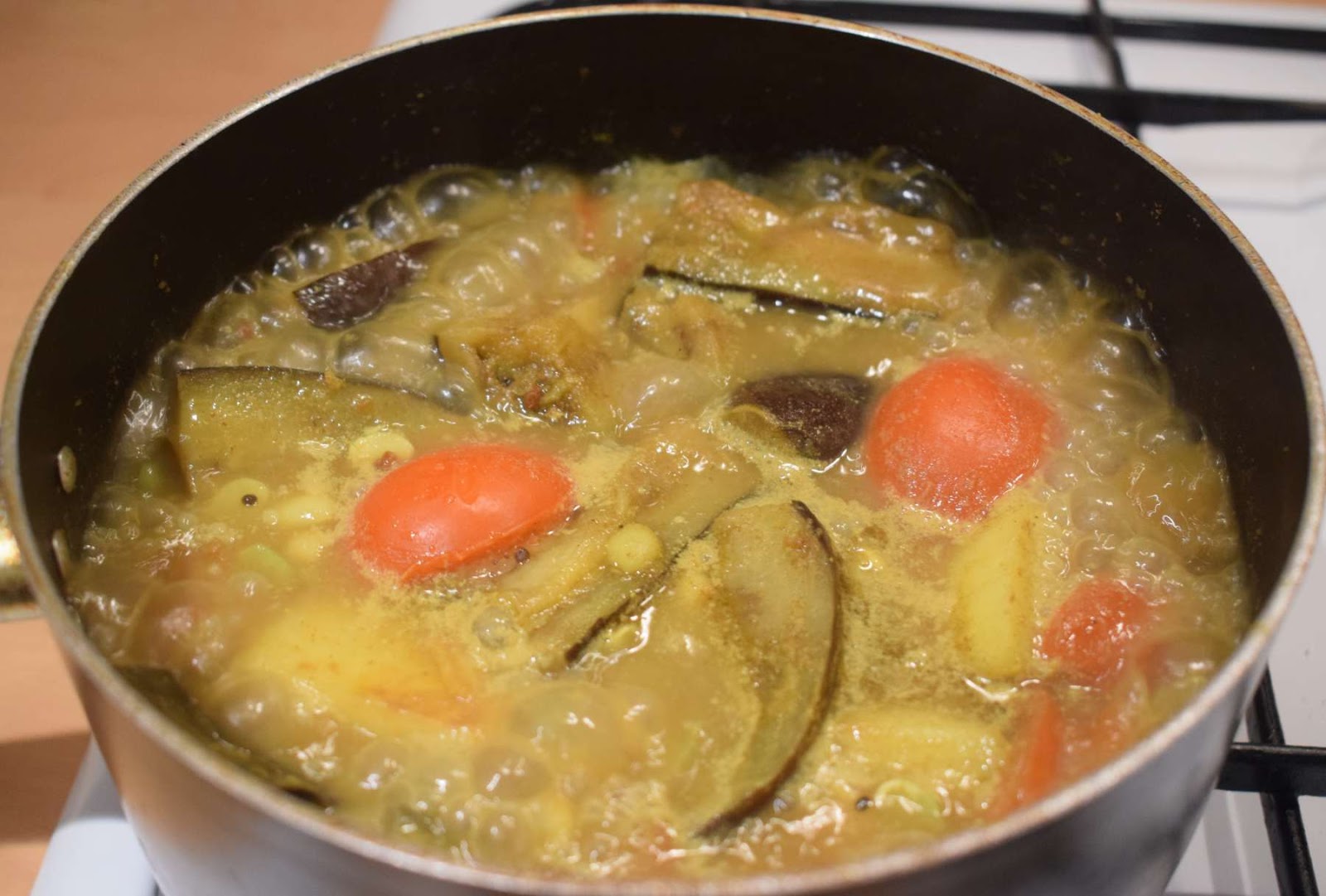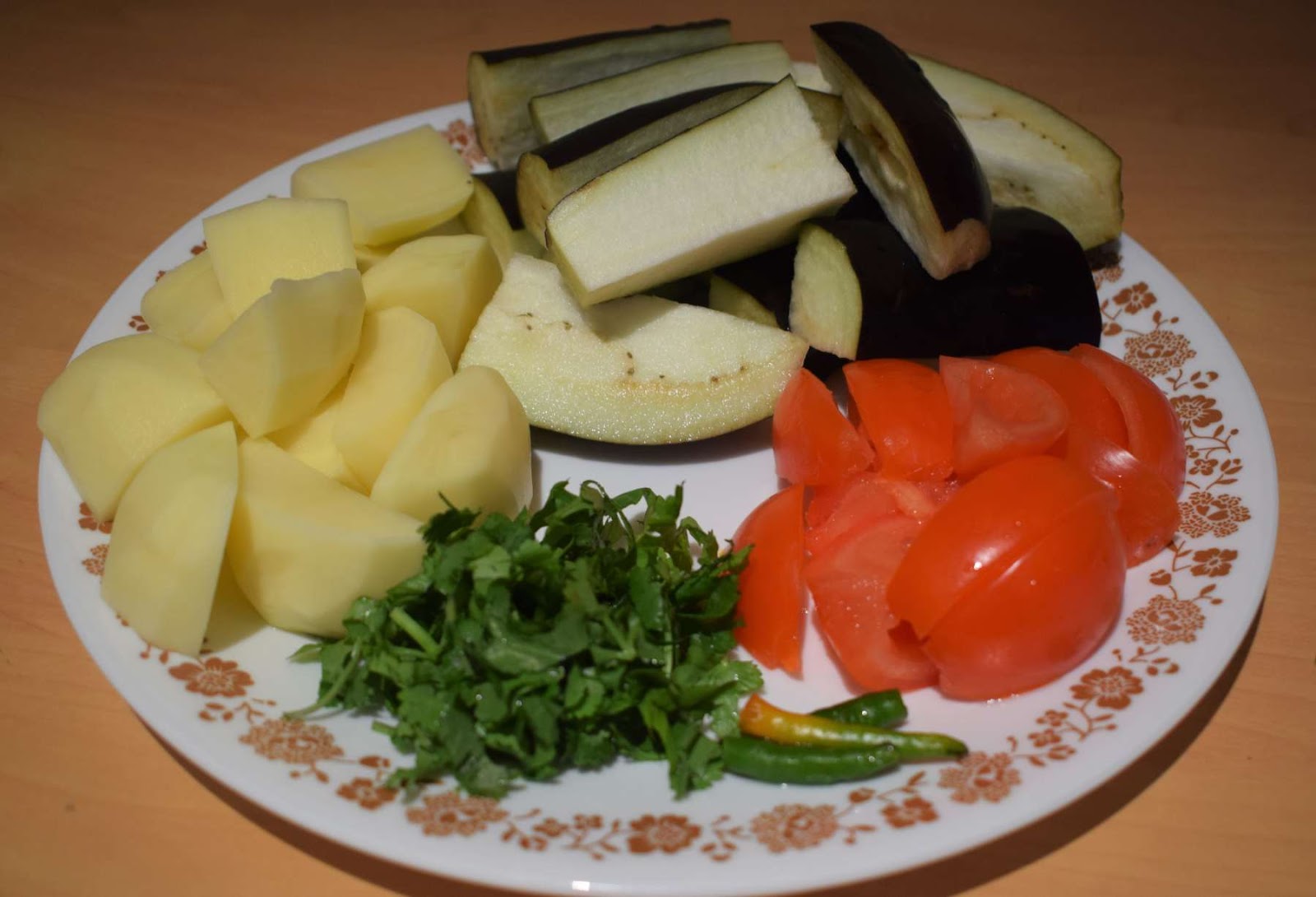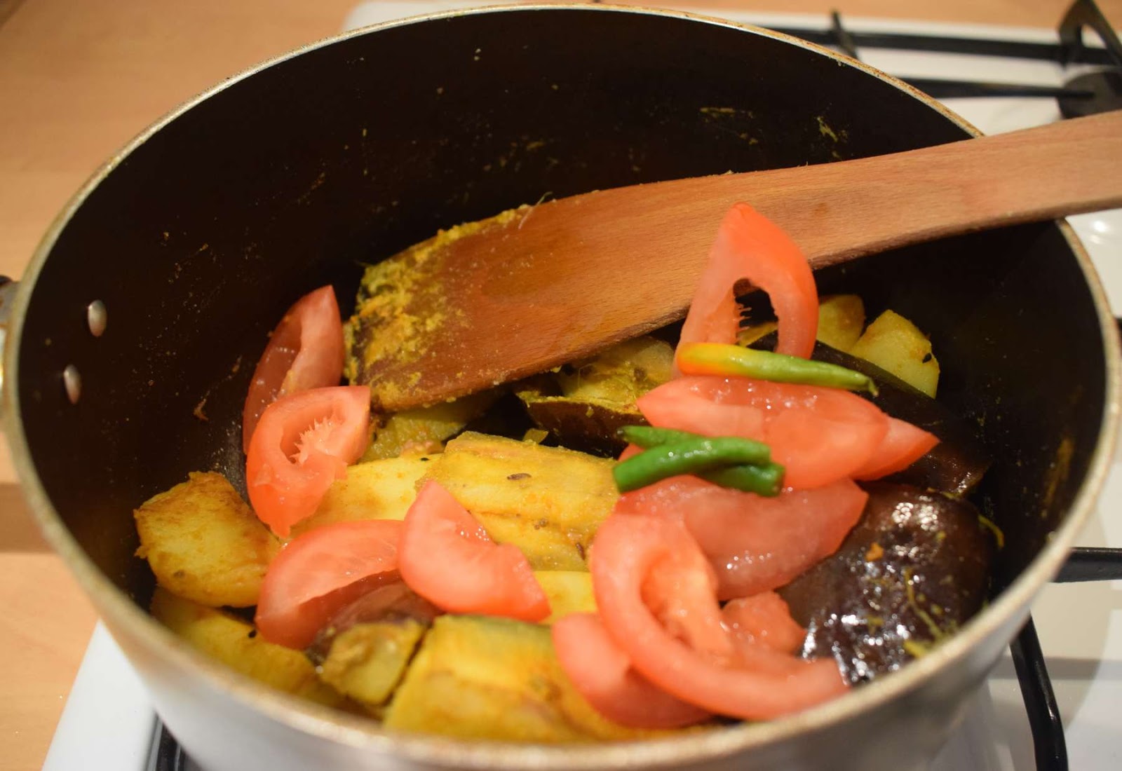 - Cover the pan and cook it in low flame for 3-4 minutes until the potatoes and brinjals get tender. Stir in between.