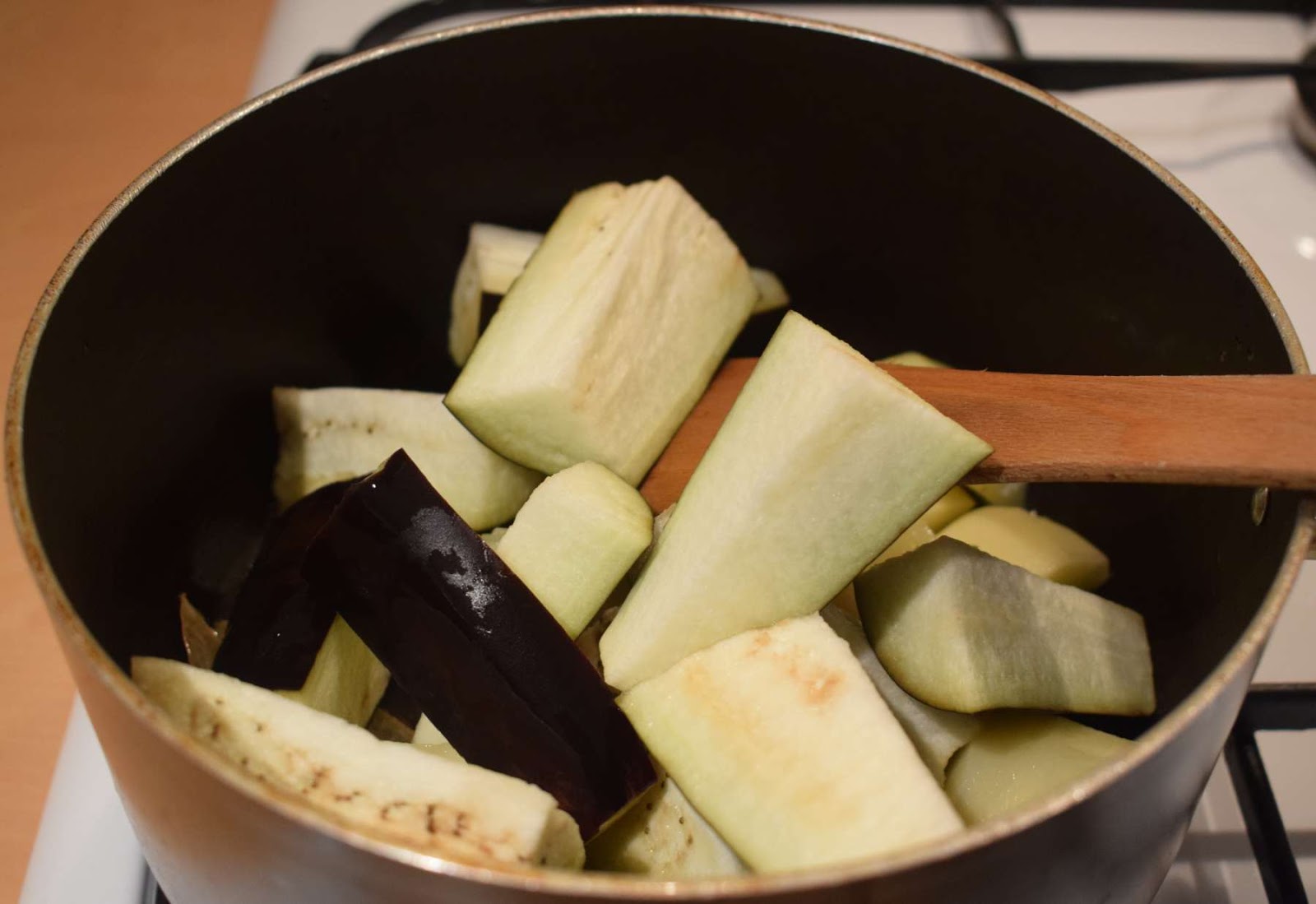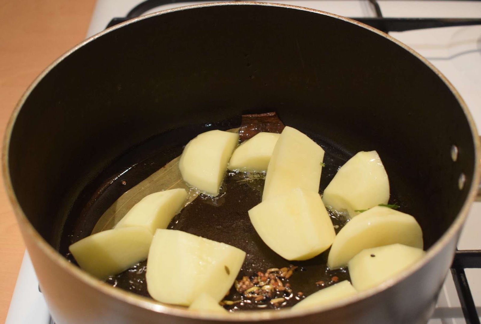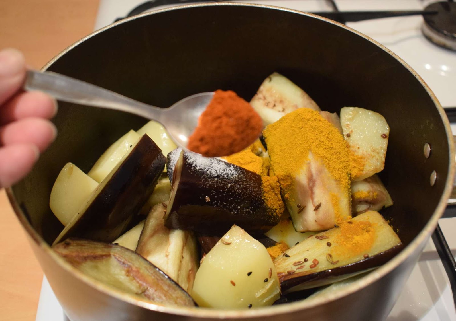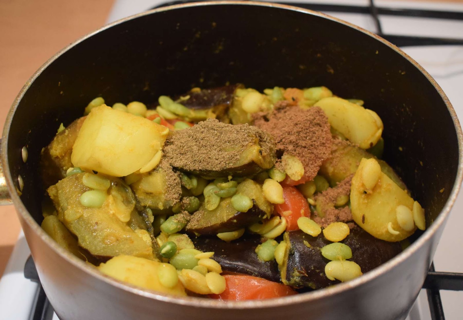 - Cover the pan and cook it in low flame for 3-4 minutes until the potatoes and brinjals get tender. Stir in between.