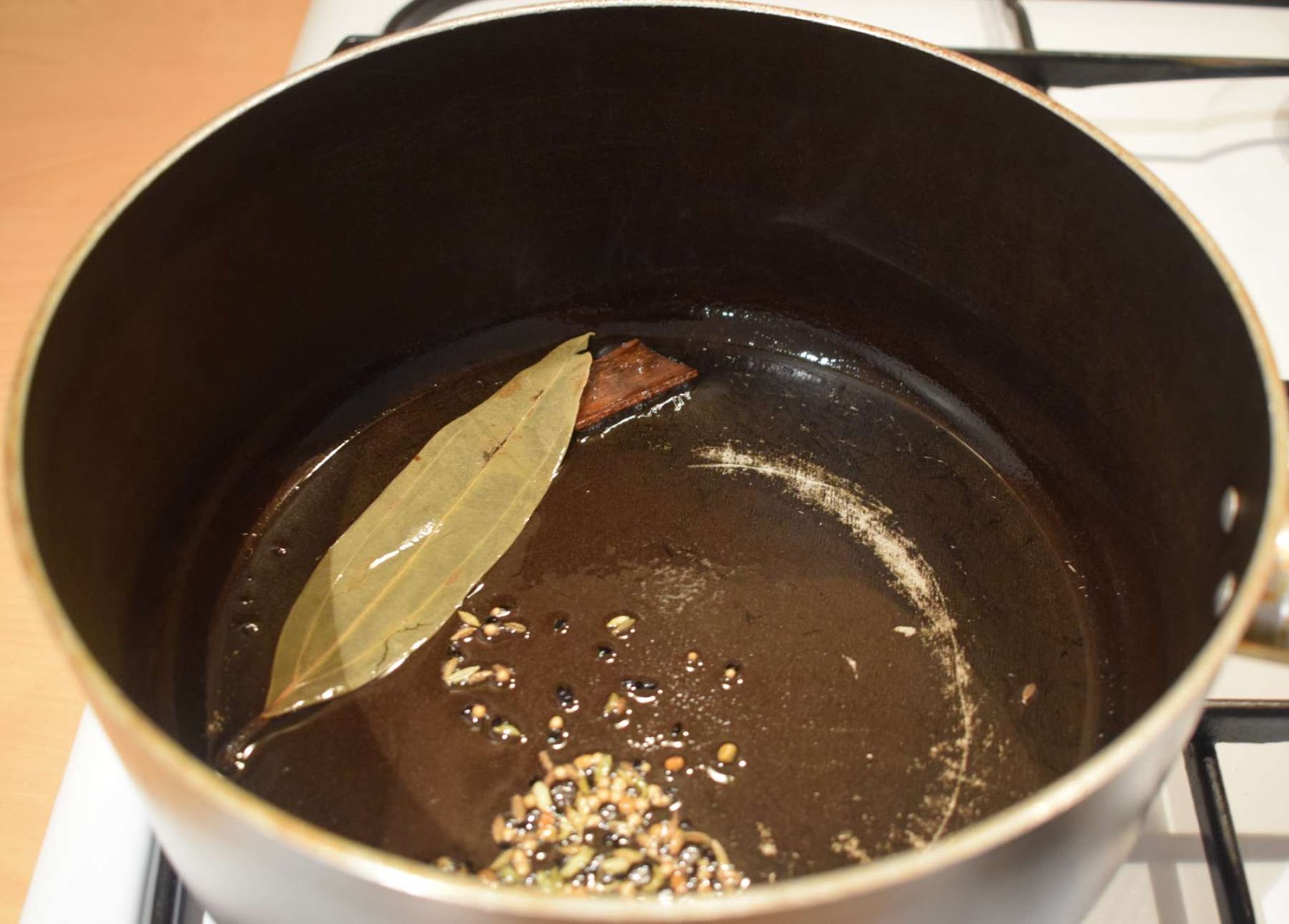 - Add panch phoran, bay leaf, cinnamon stick into the oil and let them crackle.