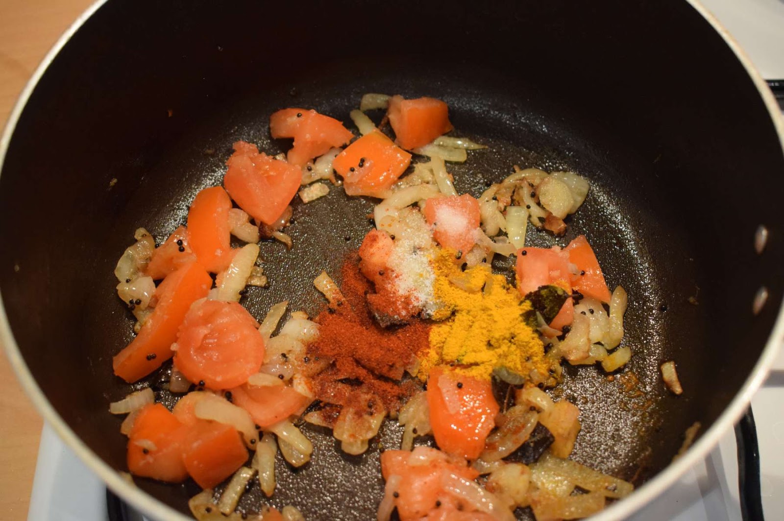 - Add the Onions and cook it for 2-3 minutes in medium high flame until it becomes translucent.