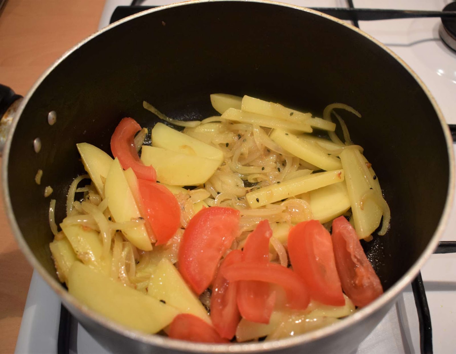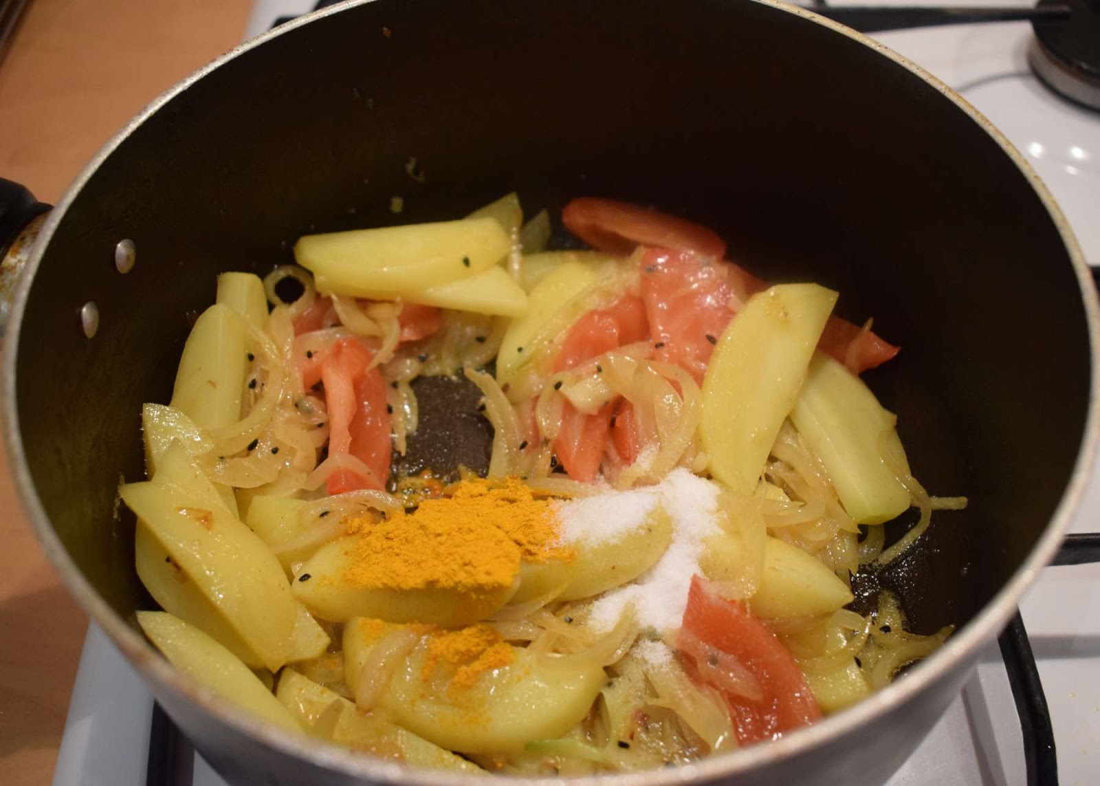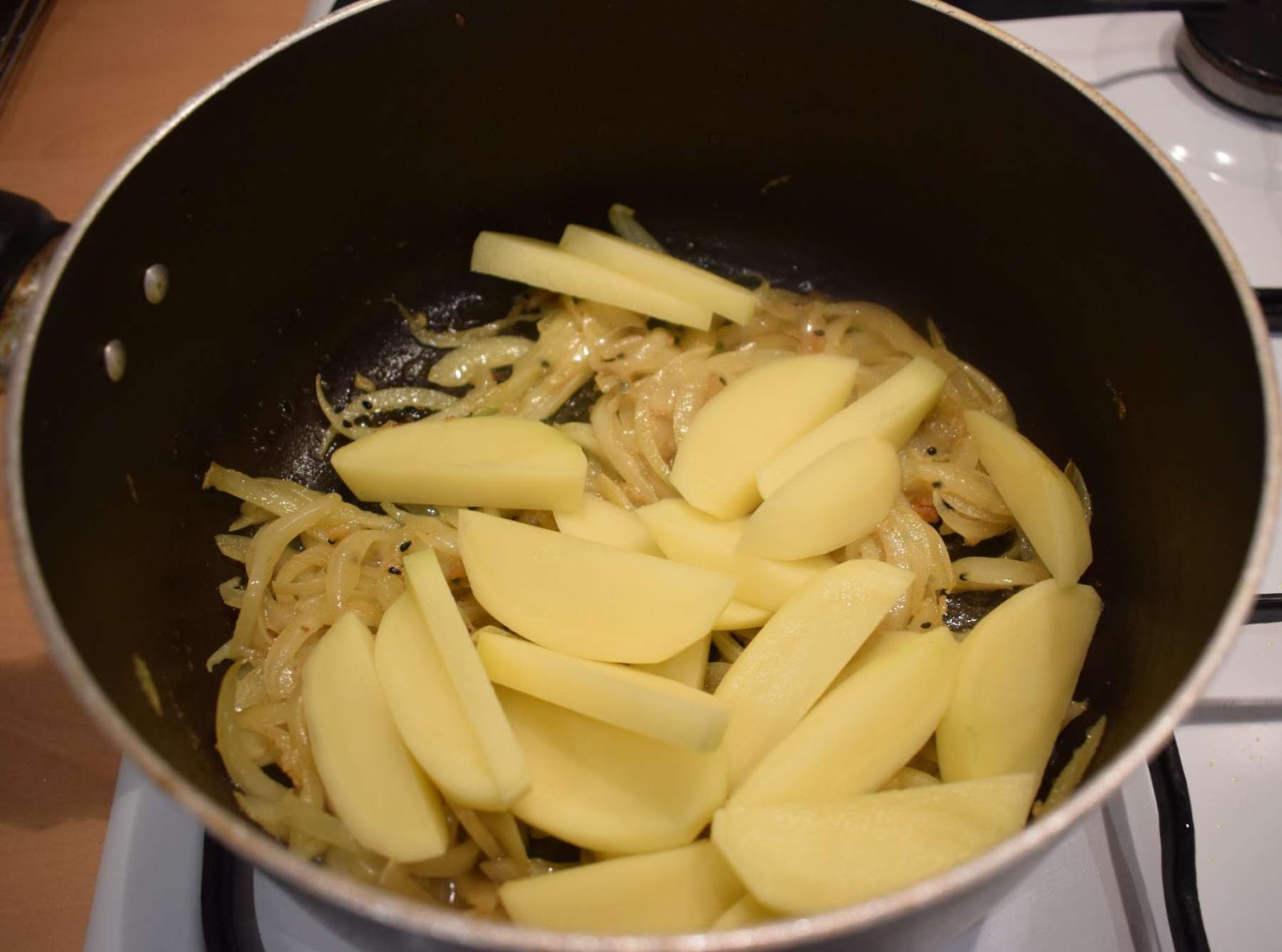 - Add Potatoes into the pan and mix them with Onions and green Chillies.