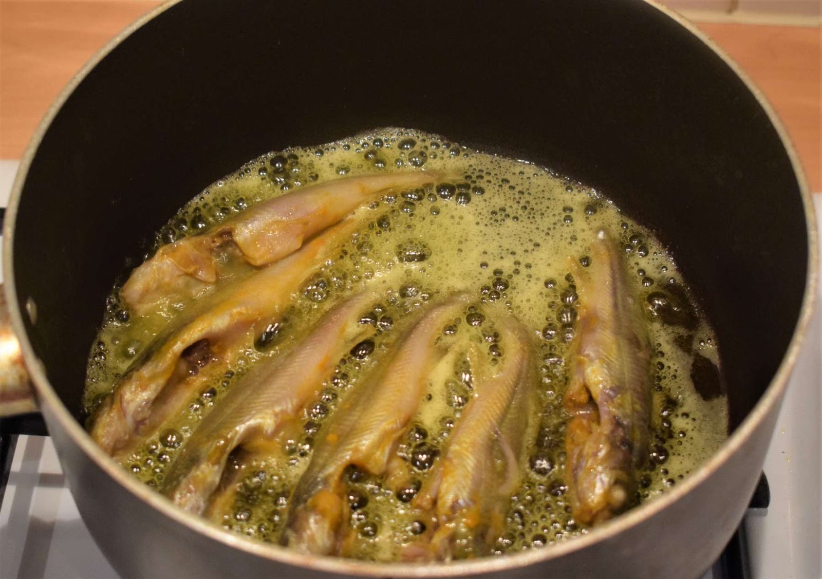 - Once the bottom side is done, turn the fishes very gently and fry another side.