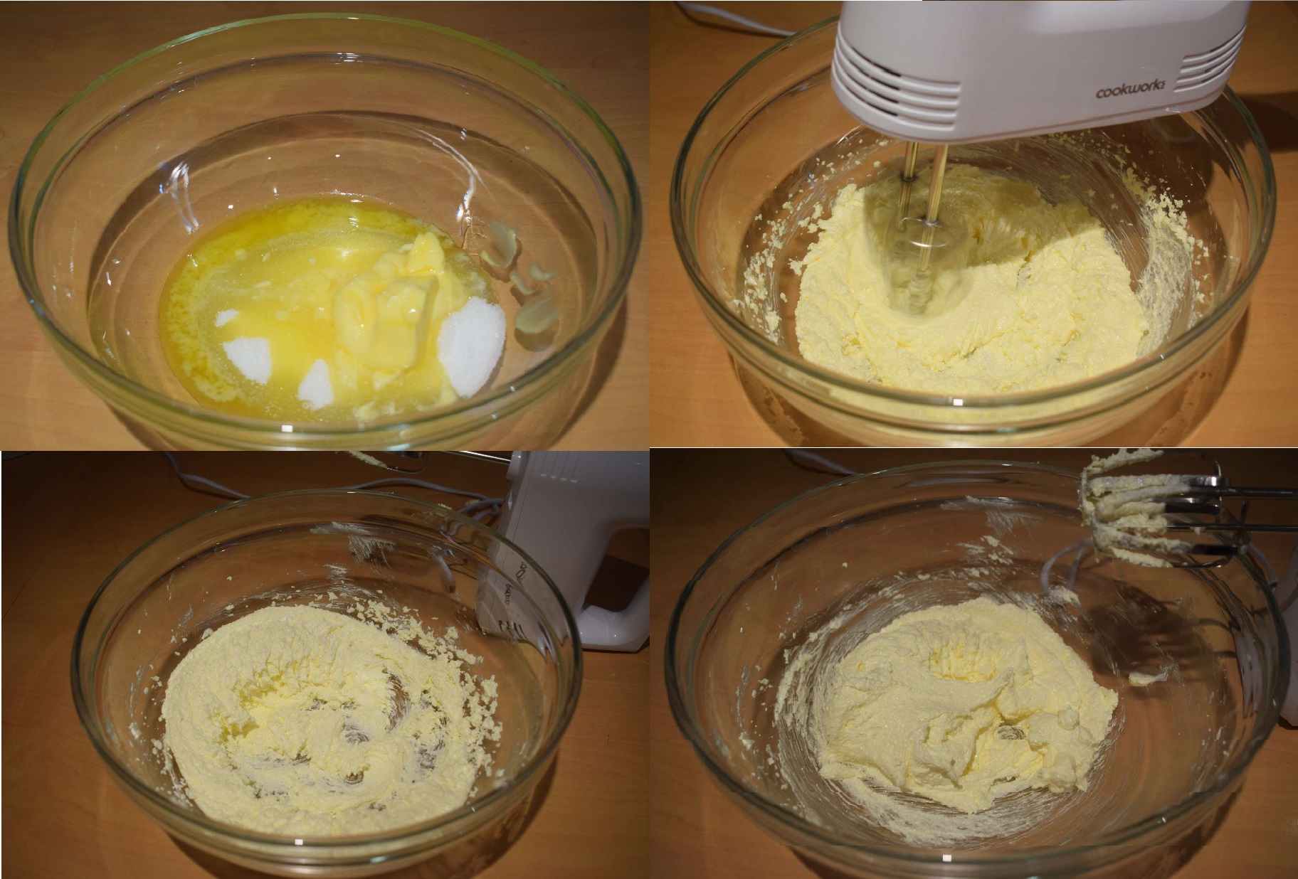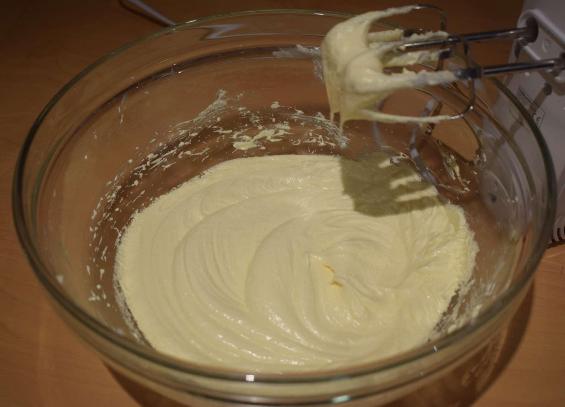 - Pour the melted butter (Step 5) into the mixing bowl and mix it with the help of a hand mixer. Mix all the ingredients evenly in medium speed till it becomes smooth and creamy. This process takes around 6-8 minutes to be done perfectly. Scrap the sides and up the bottom with the help of a rubber spatula when required.