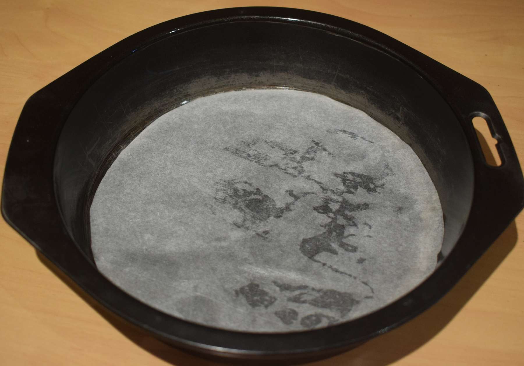- On the other hand, grease an 8-inch diameter cake tin with butter and cut a piece of parchment paper to fit the bottom of the tin. Keep the cake tin aside.