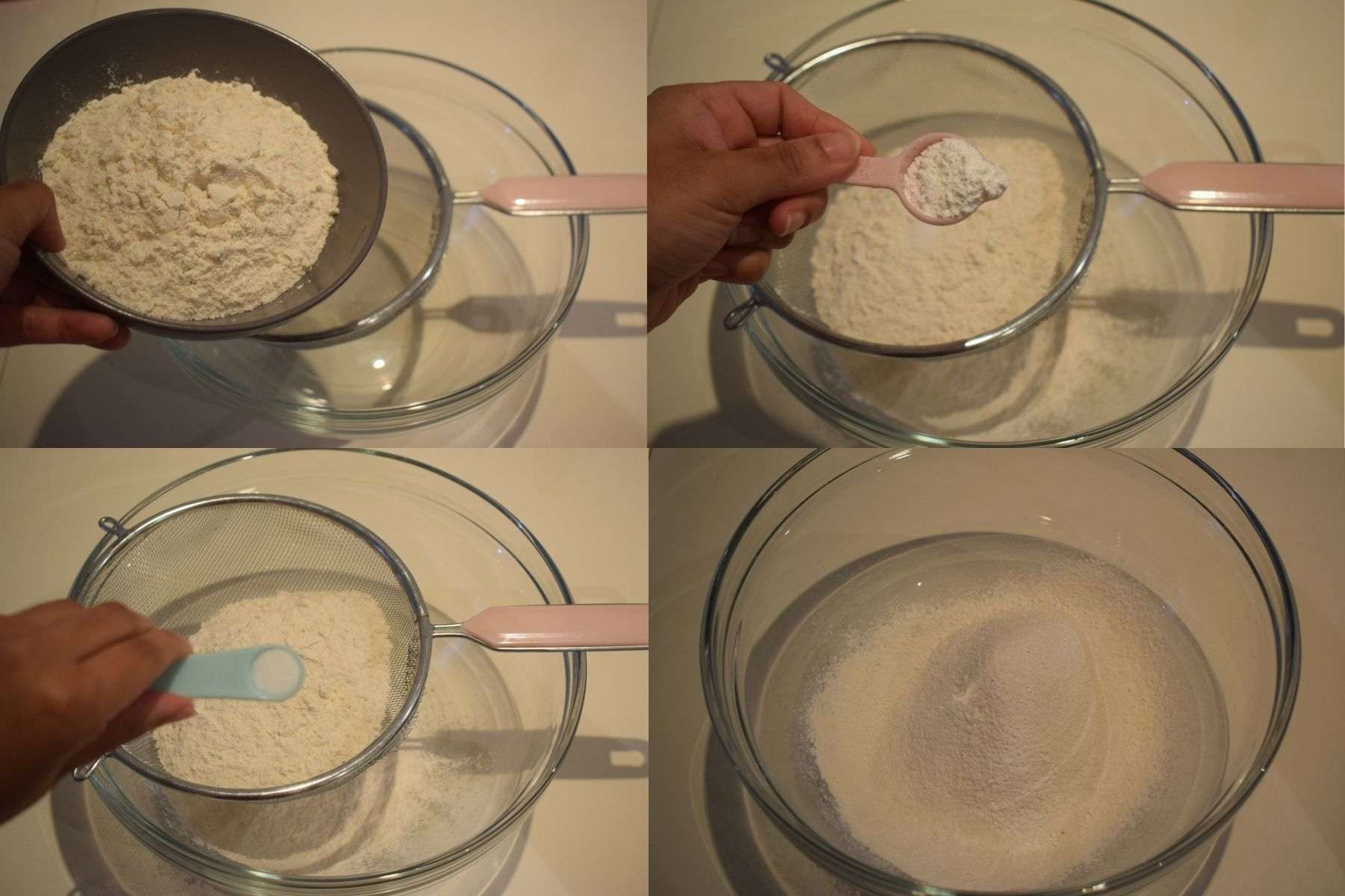 - Sieve 1¼ cup all-purpose flour, ¼ teaspoon salt, ½ tablespoon baking powder together and keep it aside.