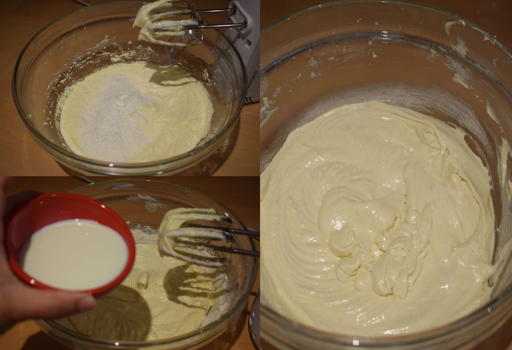 - Add the sieved flour mixture (Step 4) and milk alternately in three batches into the batter and mix it in low speed with hand mixer. First add 1/3rd portion of the flour mixture and mix in low speed. Then pour 1/3rd portion of the milk. Repeat the process twice more. Scrap the sides and up the bottom with the help of a rubber spatula. Make a smooth lumps free batter. The batter will be sticky in texture.