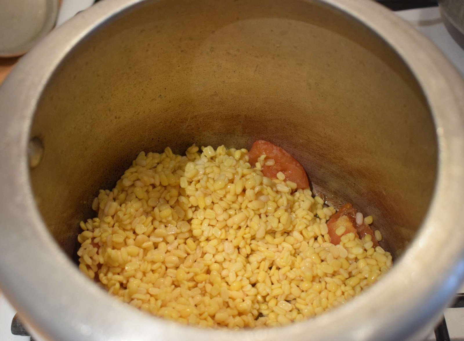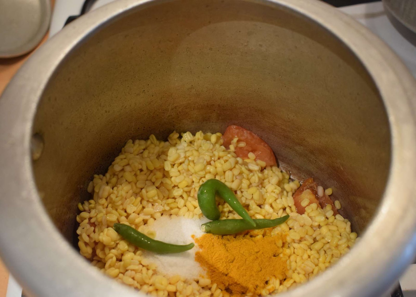 I have added Tomatoes, Ginger paste to the dal. The Tomatoes give a ting of tanginess and sweetness to the dal which enhances the taste of the dish. The flavour of fresh Ginger goes amazing with Moong dal.