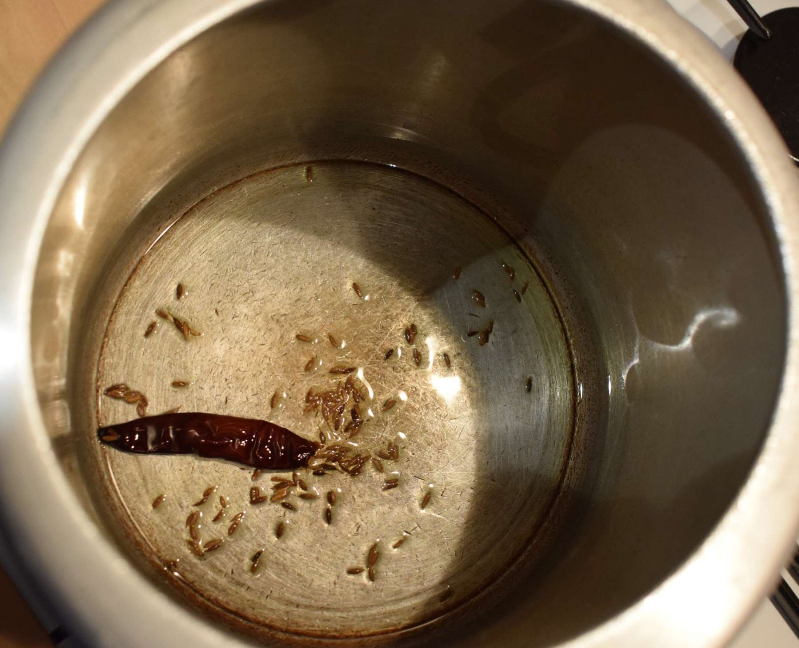 - Let the Ghee melt then add red whole dried Chilli and Cumin seeds (Jeera).